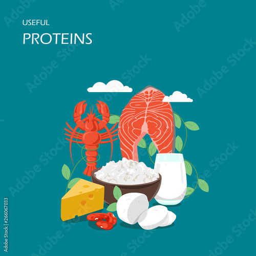 Užitečné proteiny vektor plochý styl designu ilustrace. Maso, mléčné výrobky kuřecí maso, hovězí maso, mléko, švýcarský sýr, tvaroh, tofu a fazole. Složení potravin s vysokým obsahem bílkovin pro webovou stránku banneru atd
