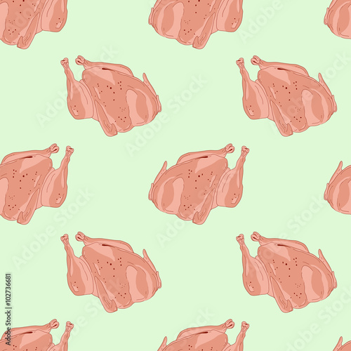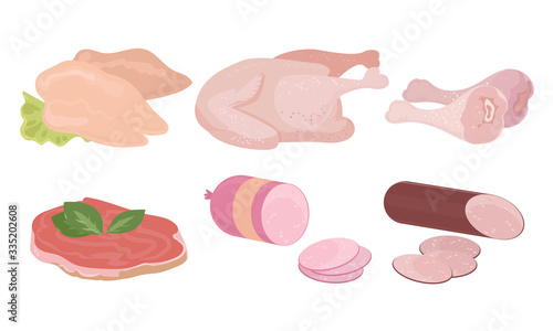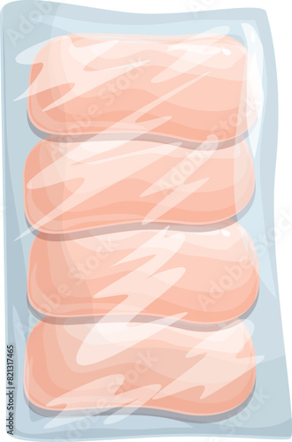 Vakuové drůbeží maso potraviny vektorové ilustrace. Soubor čerstvé syrové kuře bosy nohy filety párky s polyethylenem kuchyně saran film supermarketu