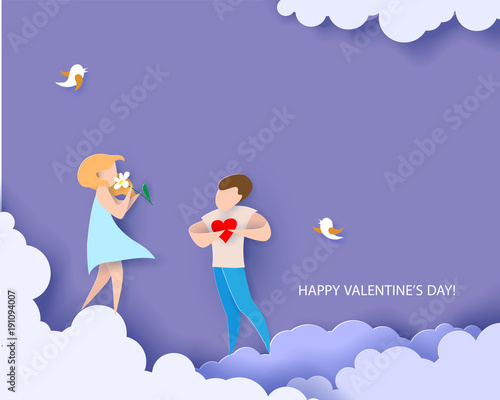 Vrstvené papírové řezané srdce se šťastným roztomilým dětským párem, který kráčí po nadýchaných oblacích a drží se za ruce. Vektorové ilustrace v papírové umění řemesla stylu. Valentines Day blahopřání šablony.