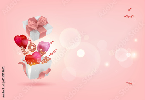 Otevřená dárková krabička se srdíčky, jahodami, notami, klíč od zámku srdce. Vektorové ilustrace ve stylu papírového umění. Šťastný Valentines Day blahopřání plakát, banner design šablony.