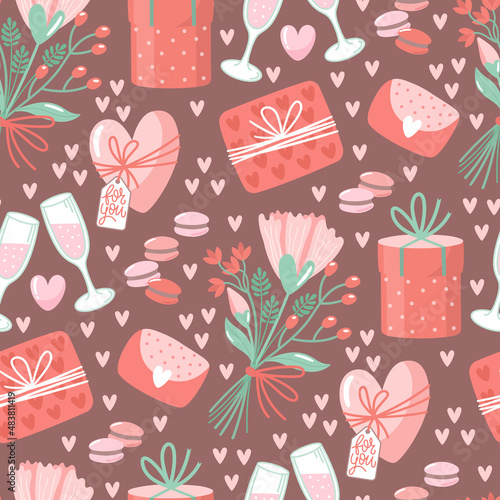 Valentines Day bezešvé vzor, vektorové ilustrace. 14. února Valentýna design dekorace pozadí s květinami, cukroví, dopis.