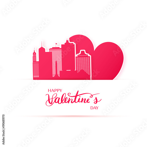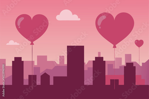 Valentines Day sociální média příběh, příspěvek, fotorámeček vektorové šablony. Velké vrstvené papírové řezané srdce a horkovzdušný balón s dárkem létajícím nad městem. Kreativní kompozice pro plakát, banner, obal, kartu.