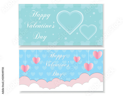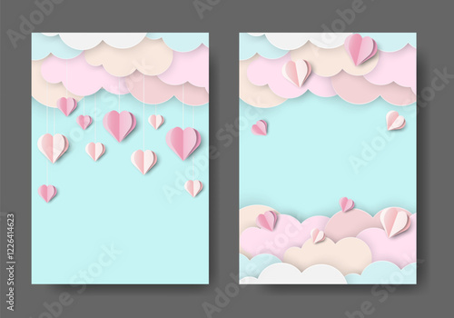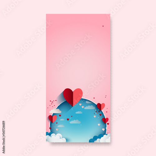 Valentines Day social media story, příspěvek vektorová šablona. Papírové řezané řemeslné srdce létající vysoko na obloze. Romantická láska kreativní kompozice pro plakát, banner, kryt, kartu.