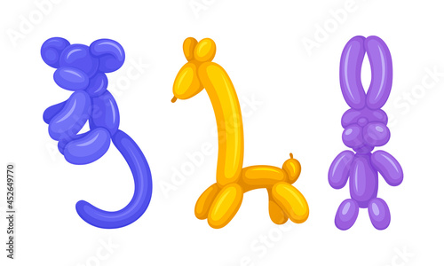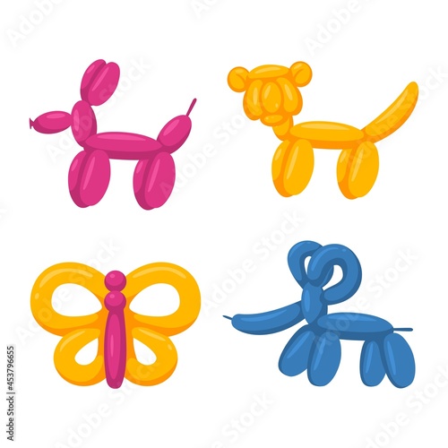 Vektorové balón zvířata sada se psem, žirafa, labuť, opice, ryby, motýl a květina. Hračka balón zvířata a květiny pro děti party narozeniny. Realistické ilustrace izolovaných na bílém pozadí.