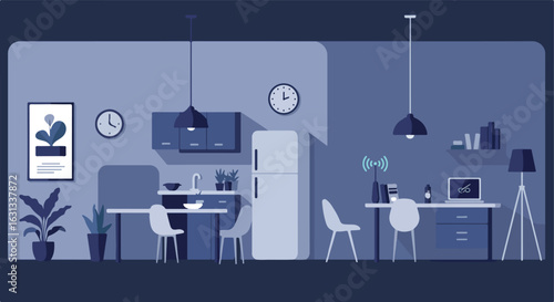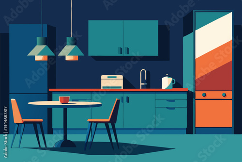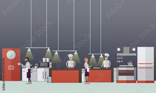 Vektorový banner s interiéry restaurací. Kuchaři vaření jídla v kuchyni místnosti. Vektorová ilustrace v plochém provedení.