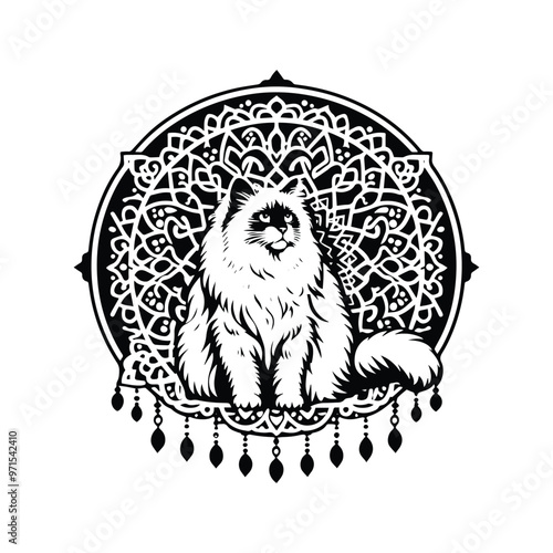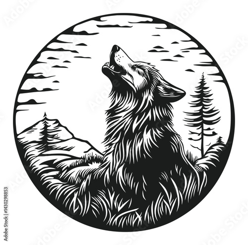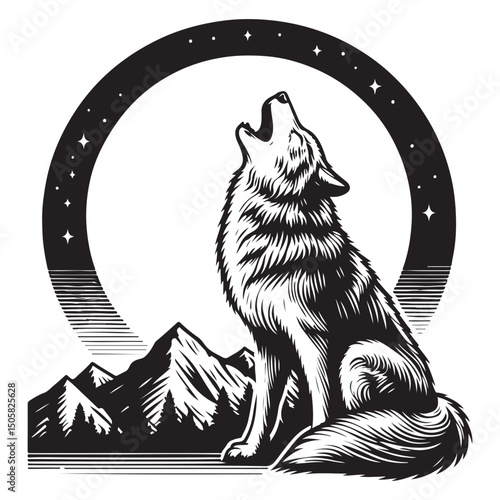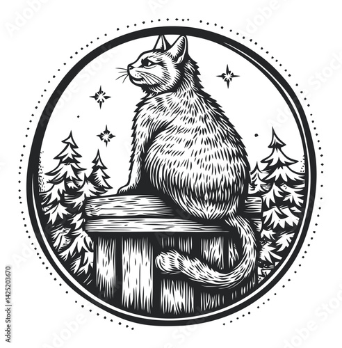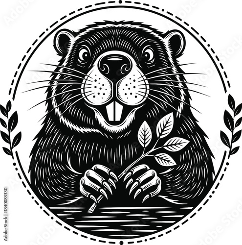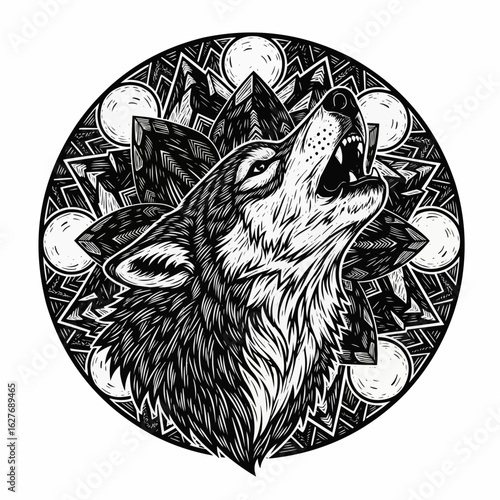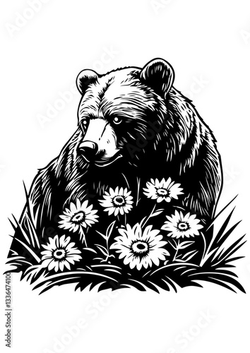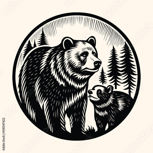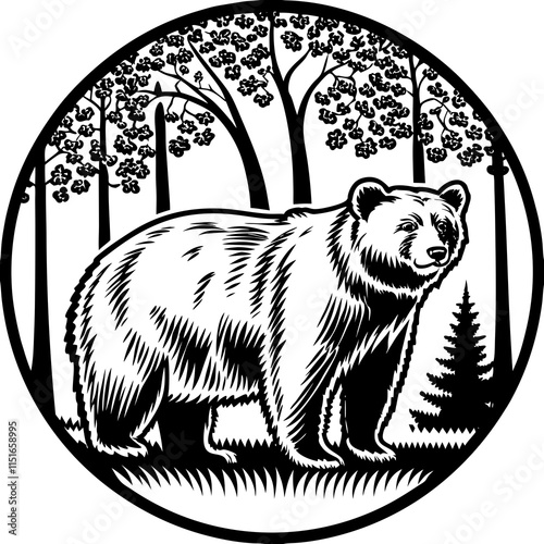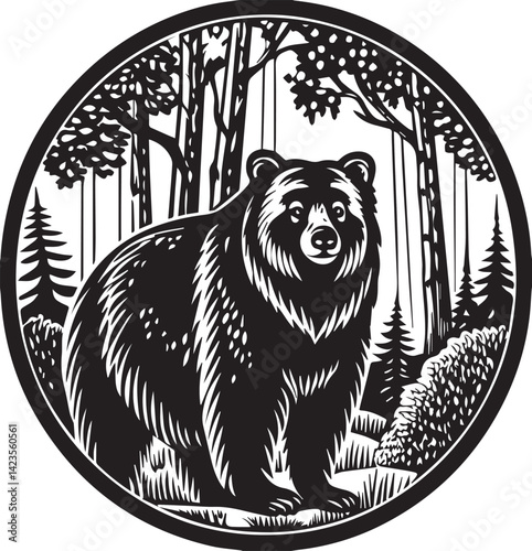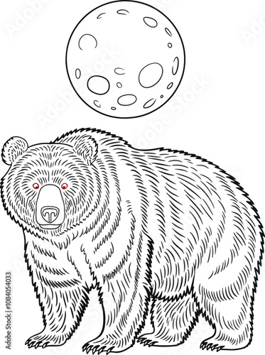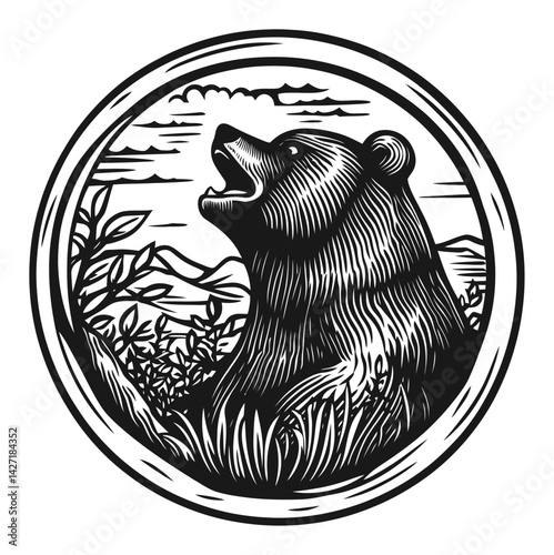Vektorové zvířecí tetování nebo potisk trička. Medvědí hlava v kombinaci s přírodou v kulatém rámu s fázemi měsíce.
