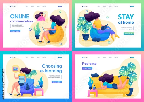 Sada vektorových karet s mladou ženou, která čte knihu, když stojí, leží doma i venku a inspirativní citáty o čtení. Plochý styl designu