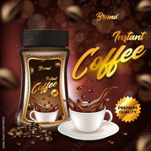 Instantní káva ad. Vektorové realistické pozadí s instantní kávou, šálkem kávy a kopírovacím prostorem. Značka kávy, plakát, šablona návrhu letáku.