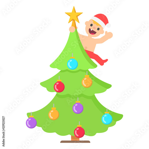 Vektorové roztomilý vánoční kočka. Cartoon šťastný domácí zvířecí postava na sobě santa klobouk a vánoční světlo věnec stojící v blízkosti zdobené jedle. Přání pro zimní dovolenou