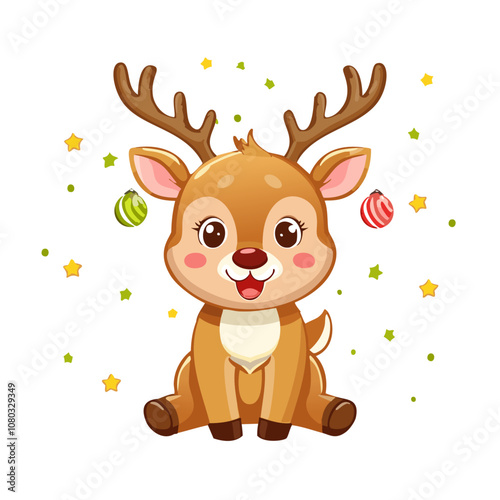 Vektorové roztomilé vánoční veverka. Kreslená Šťastná lesní zvířecí postava na sobě sobí čelenku držící ozdobné koule pro dekoraci jedle. Přání pro zimní dovolenou