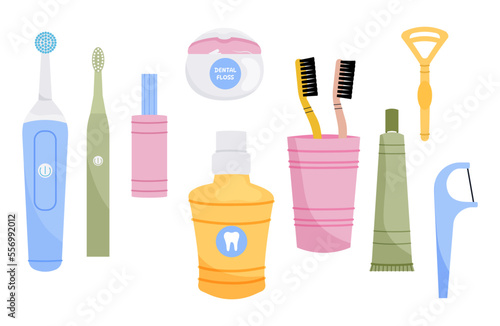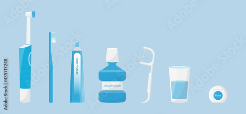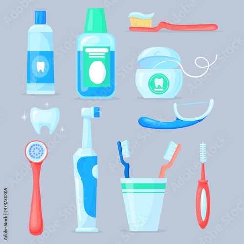 Vektorové zubní čisticí nástroje sada. Zubní pasta, zubní kartáček, ústní voda, zubní nit, škrabka a párátko. Výrobky pro péči o ústní dutinu, sada na čištění zubů realistická ilustrace.