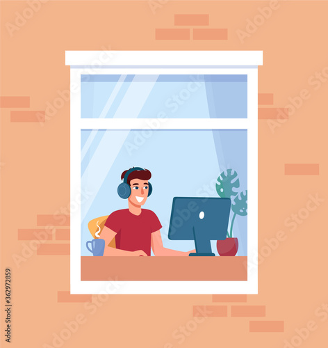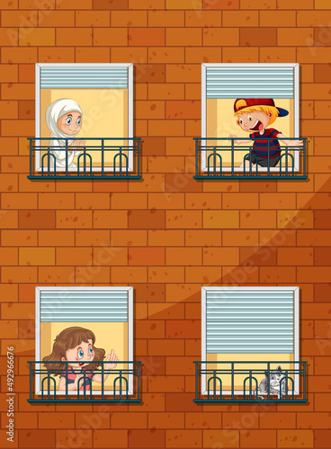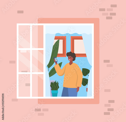 Vektor rodinný pár stojící u okna a díval se ven ilustrace. Muž a žena Doma karikatura. Self-bezpečnostní čas nebo uzamčení slušný koncept