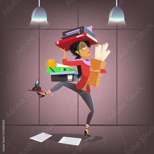 Vektorová ženská obchodní postava v kresleném stylu. Busy multitasking office manager. Sekretářka společnosti nebo osobní asistent šéfa.