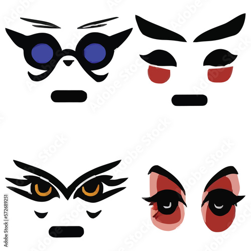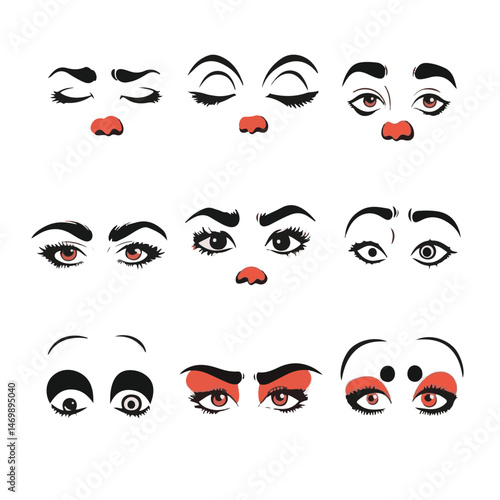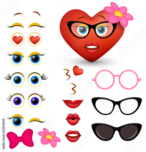 Červené srdce ženské postavy emoji maker, Smiley creator. Vektorová sada emotikonových obličejových dílů a doplňků, jako jsou brýle, luk, květina pro vaše vlastní chladné ženské srdce emodži.