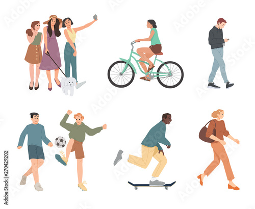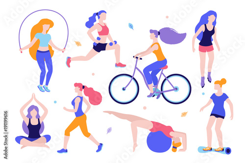 Vektorová sada ikon fitness postav. Lidé cvičí jógu, cvičí s činkami, činkou a jízdními koly. Ploché styl designové prvky izolované na bílém pozadí.