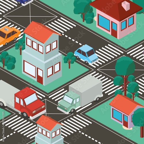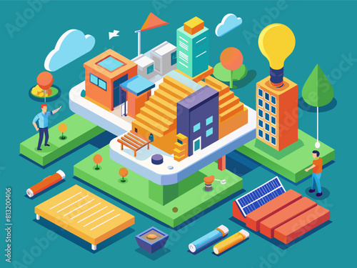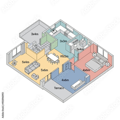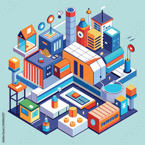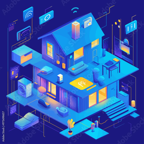 Vektor plochý 3D izometrický dům s pokoji v řezu. Detailní moderní interiér domu s nábytkem a domácími spotřebiči. Ilustrace konceptu chytré domácnosti.
