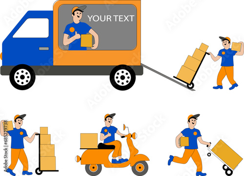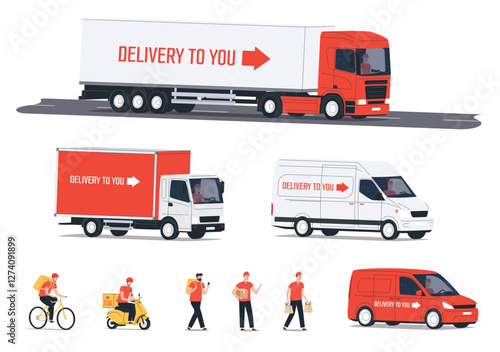 Vektorové ikony sada dodávky potravin profese lidí izolovaných na bílém pozadí. Kurýři dodávající jídlo pěšky, na kole, kamionem a koloběžkami s plochými designovými prvky.