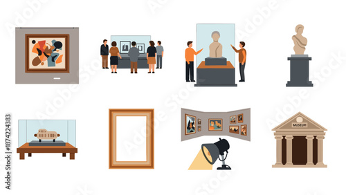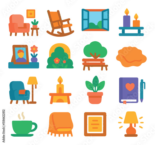 Vektorové ikony sada moderního domu a garáže s rodinnými postavami a domácími zvířaty izolovanými na bílém pozadí. Ploché designové prvky.