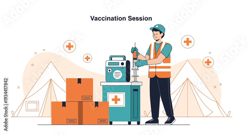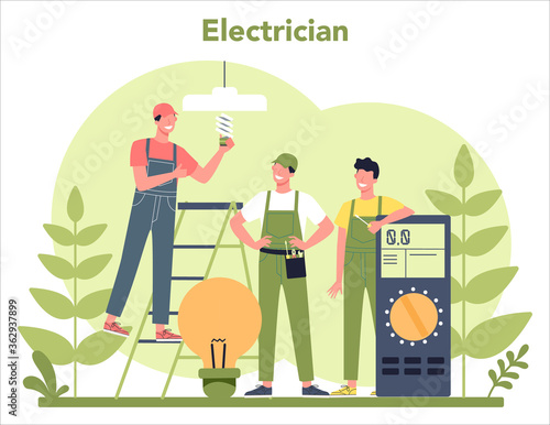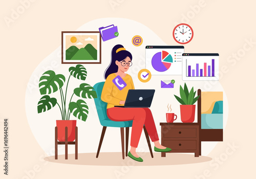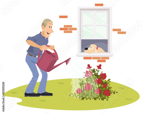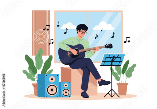 Vektorová ilustrace uklízečky nebo hospodyňky, která poslouchá rádio při mytí podlah houbovým mopem. Designový prvek konceptu rozhlasové stanice v plochém stylu.