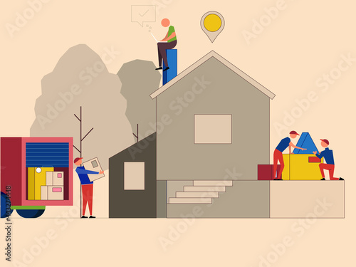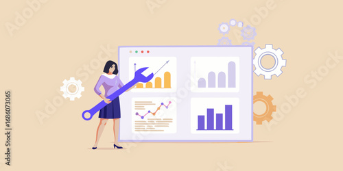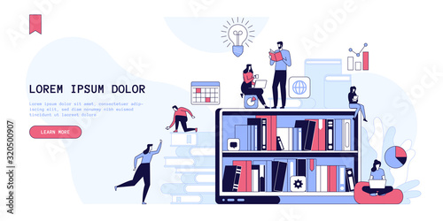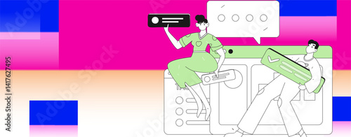 Vektorová ilustrace umělé družice otáčející se kolem Země, personál řídícího střediska mise monitorující všechny aspekty průzkumu vesmíru. Plochý designový prvek.