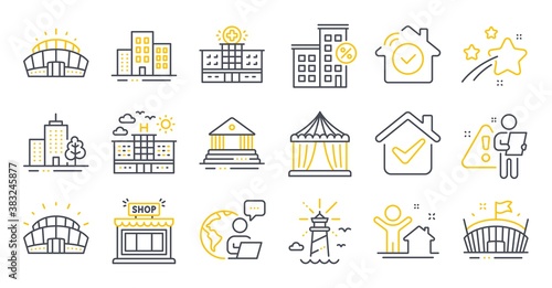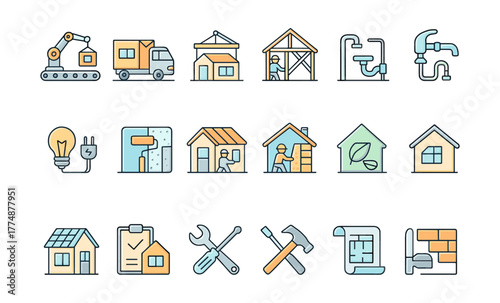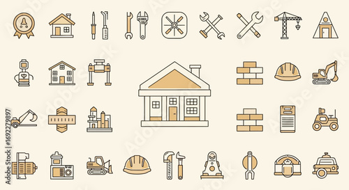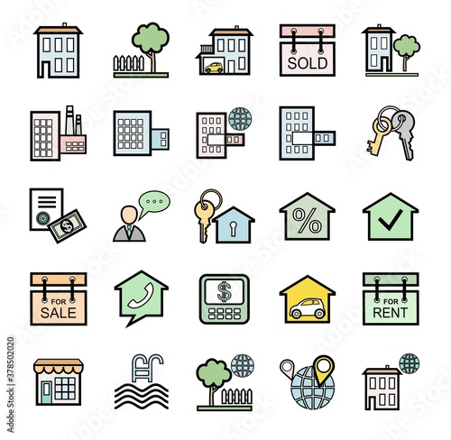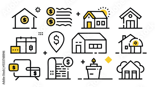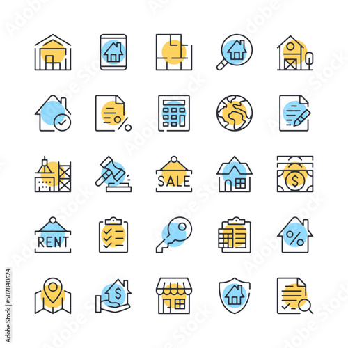 Vektorový Bezešvý vzor s dekorativními symboly domu, ikonami. Nemovitosti a nemovitosti pozadí, balicí papír textura tenká čára umění plochý styl designu.