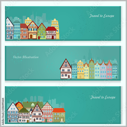 Vektorová sada horizontálních bannerů s nákupem domu, nemovitosti, podpora linie umění plochého stylu designových prvků, webových šablon.