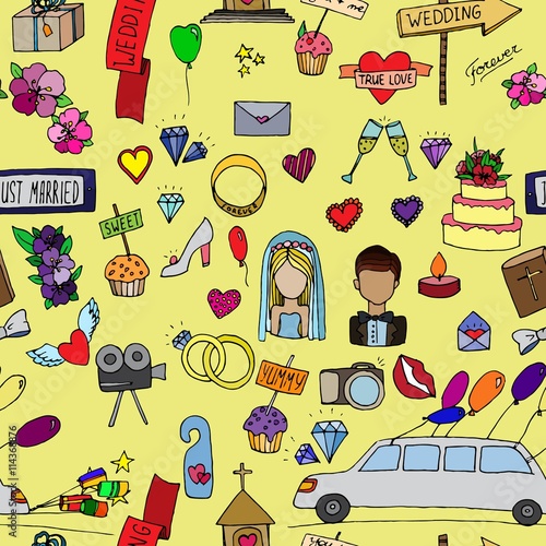 Vektorový Bezešvý vzor s ozdobnými svatebními symboly, ikonami. Svatební pozadí, balicí papír textura tenká linie umění plochý styl designu.