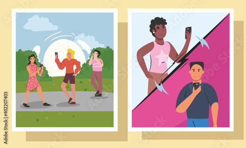 Vektorová sada plakátů s hudebníky, muži a ženy hrajícími na hudební nástroje. Kontrabas, saxofonista, akordeonista a flétnista plochý styl designové prvky.