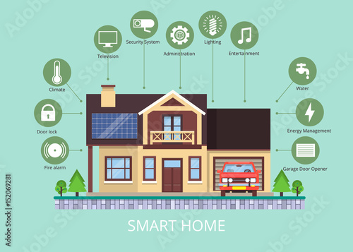 Vektorová ilustrace konceptu Smart home. Dům v řezu pohled a garáž. Detailní moderní interiér domu s nábytkem a domácími spotřebiči. Inteligentní dům symboly, ikony v plochém stylu.