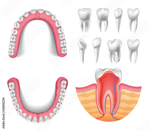 Zdravé neošetřené zuby a zubní kazy nebo dutiny icon set. Závažnost destrukce zubů.