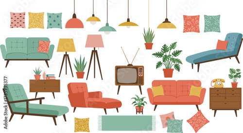 Vektorové obývací pokoj plochý design. Ilustrace domácího interiéru. Nábytek v útulném pokoji s obrázky a hodinami na zdi. Dům salonek. Apartmán Comfortable residence