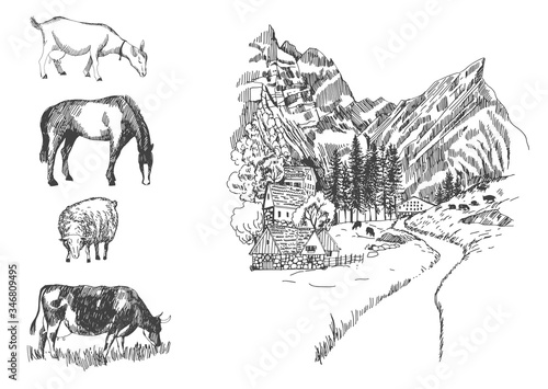 Vektorové zvířecí tetování nebo potisk trička. Vytí vlk s polygonální hlavou a přírodou v kombinaci s měsíční noční oblohou.