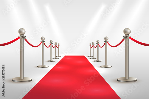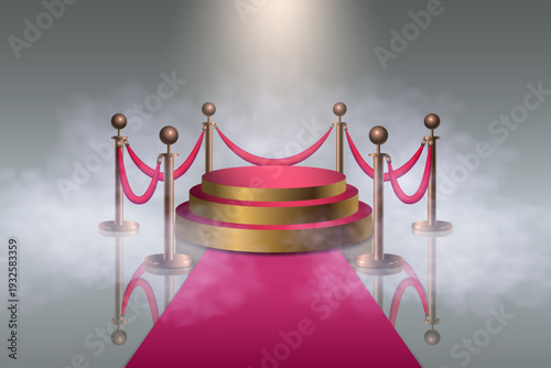 Osvětlené bílé kulaté pódium s prázdnou skleněnou vitrínou, červeným kobercem a zlatými lanovými bariérami. Vektorové realistické ilustrace. Vitrína pro prezentační výstavu.