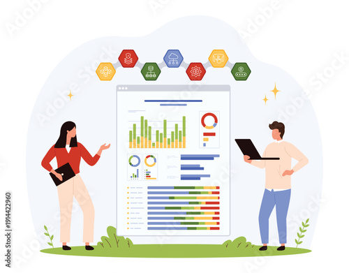 Vektorová ilustrace moderátora. Reportérka, novinářka, komentátorka. Hromadné mediální práce, designový prvek televizního vysílání v plochém stylu.