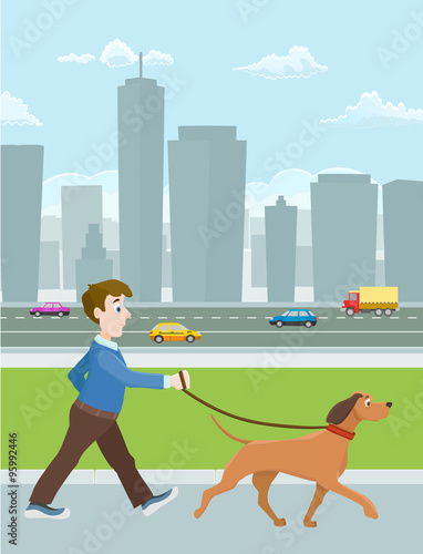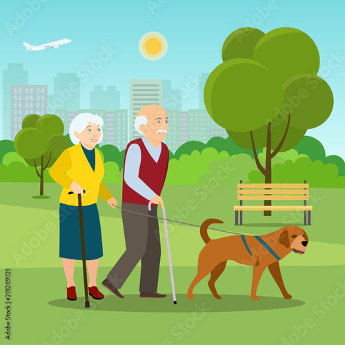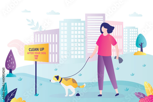 Vektorové ilustrace postižené slepé mladé ženy s holí a vodícím psem na ulici. Plochý styl designu.