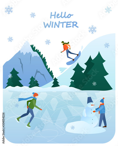 Vektorové ilustrace chlapce a dívky dělat sněhuláka. Zimní aktivity lidí koncept designový prvek v plochém stylu.