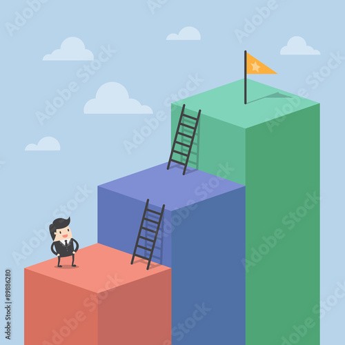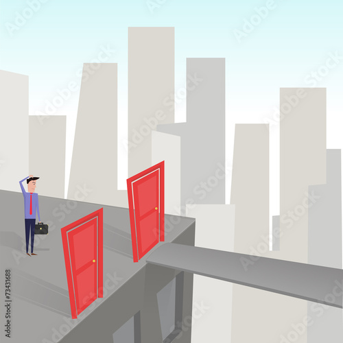 Vektorová ilustrace podnikatele stojícího na schodech před otevřenými dveřmi. Nové příležitosti a kariérní růst v obchodním konceptu plochý styl designu.