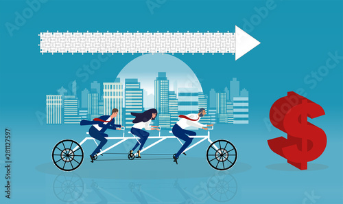 Vektorová ilustrace podnikatelů jezdících na tandemovém kole. Obchodní týmová práce koncept plochý styl designový prvek.