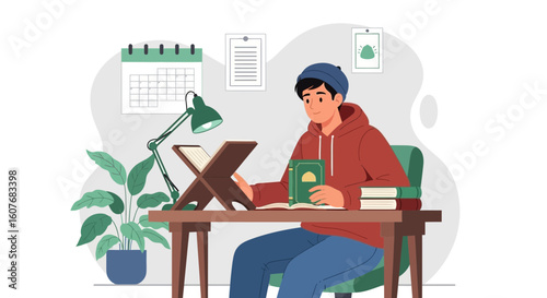 Vektorová ilustrace designového prvku kavárny s návštěvníkem na obědě. Mladý muž s mobilem sedí u stolu. Interiér kavárny a kreslená postavička v plochém designu.
