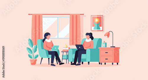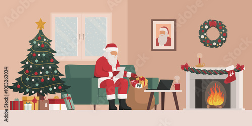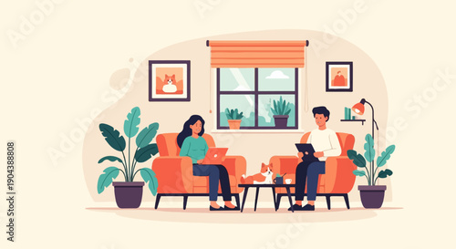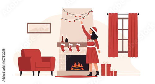 Vektorová ilustrace mladého muže a ženy sedících v křeslech u krbu zdobených vánočními punčochami. Vánoce. Veselé Vánoce a Šťastný Nový rok designový prvek v plochém stylu.