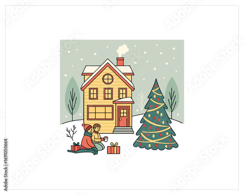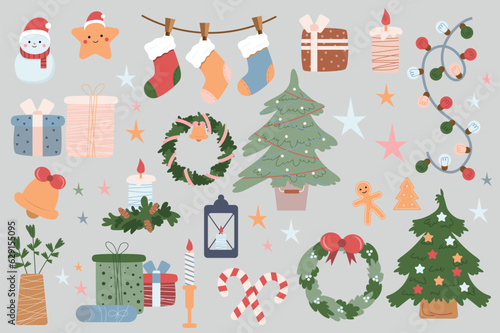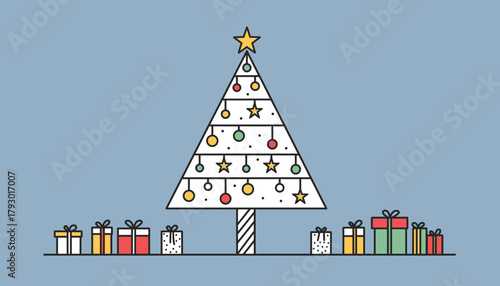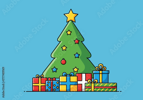 Vektorová ilustrace vánočního stromu zdobeného cetkami, světly. Dárky pod stromeček. Kočka se dotýká stromu tlapou. Interiér. Veselé Vánoce a Šťastný Nový rok designový prvek v plochém stylu
