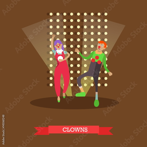 Vektorová ilustrace dvou vtipných klaunů mužů a žen vystupujících na cirkusové scéně. Klauni kreslené postavičky v plochém stylu.