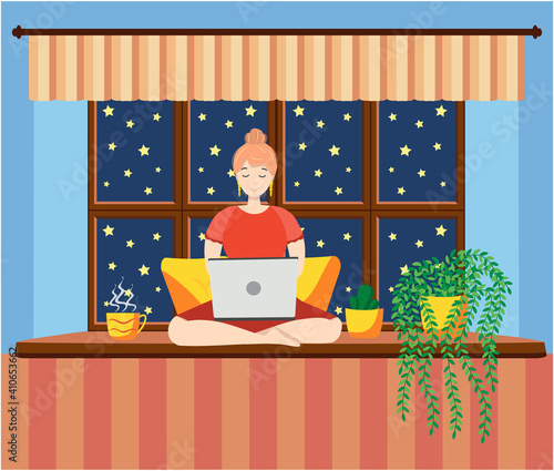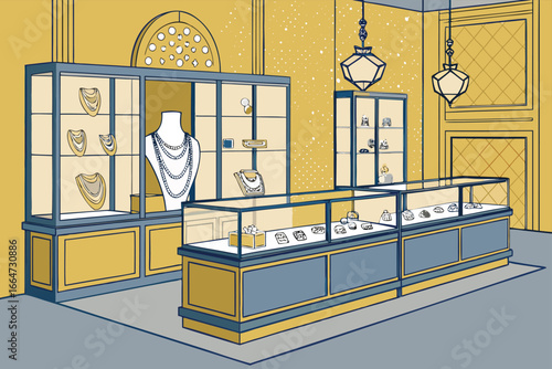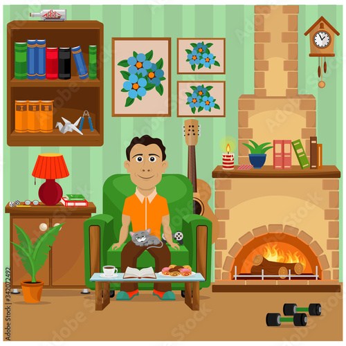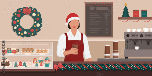 Vektorová ilustrace designového prvku kavárny s baristou stojícím za barovým pultem, kávovarem, nádobím, menu. Interiér kavárny a kreslená postavička v plochém designu.