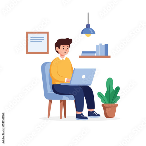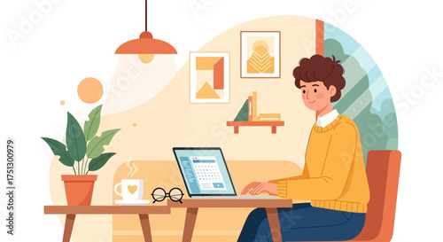 Vektorové ilustrace kavárny designový prvek s návštěvníkem, mladý muž s notebookem sedí na pohovce. Interiér kavárny a kreslená postavička v plochém designu.