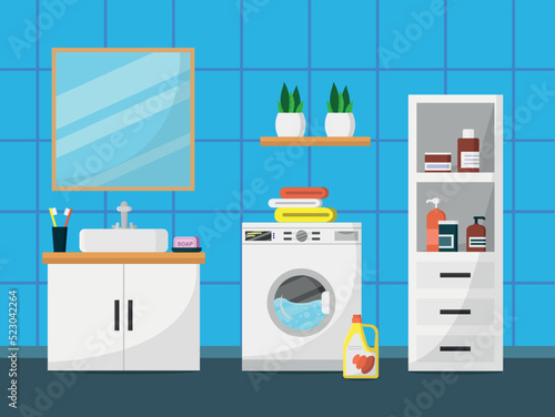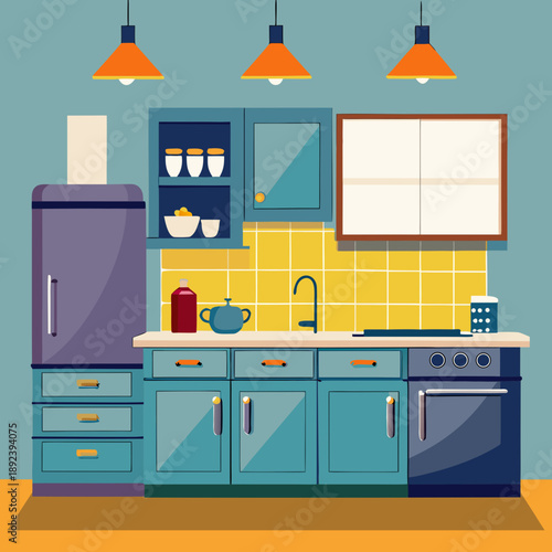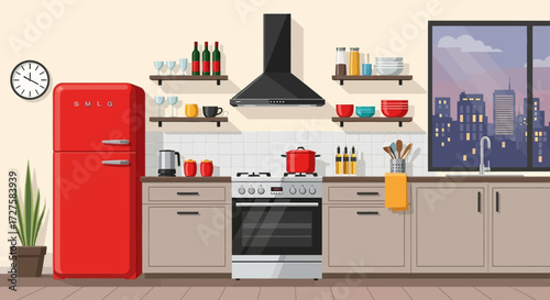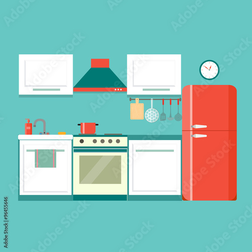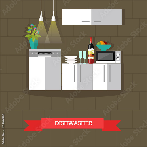 Vektorové ilustrace myčky nádobí. Interiér kuchyně s nábytkem a spotřebiči v plochém stylu. Mikrovlnná trouba, láhev vína a mísa s ovocem