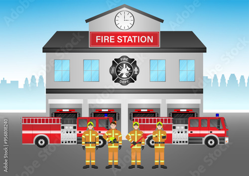 Vektorová ilustrace hasičského sboru v plochém stylu. Hasiči, běžící hasiči a hasičský vůz. Červený hasič a hasiči v uniformě. Hasič. Resque servis.