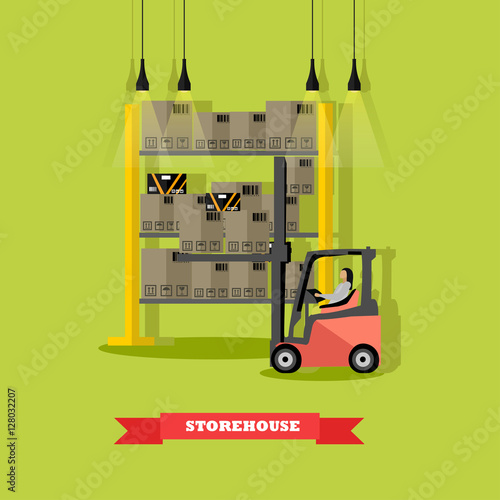 Vektorová ilustrace distribuce, odvoz zboží ze skladu vysokozdvižným vozíkem. Logistická doprava, úložný koncept designový prvek v plochém stylu.