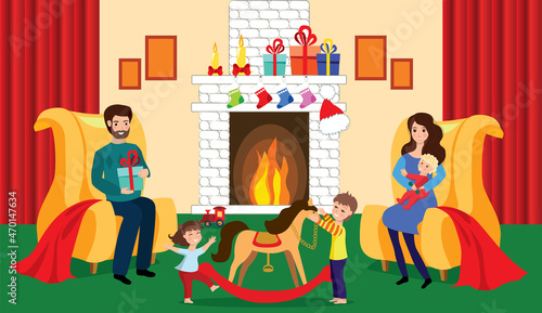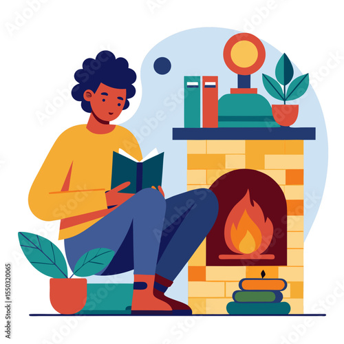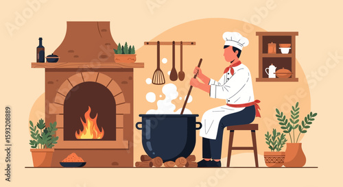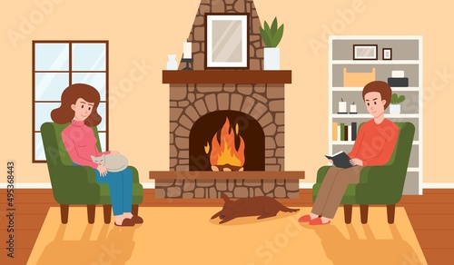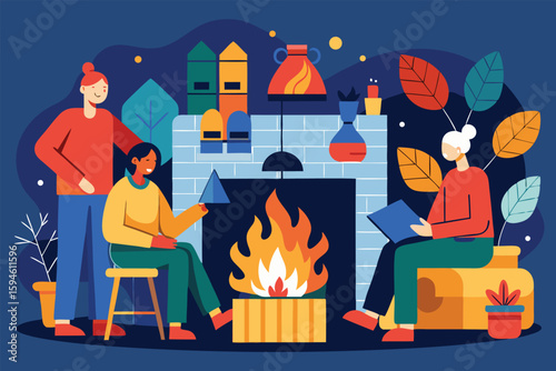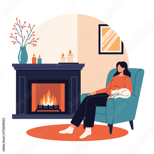 Vektorová ilustrace babičky sedící v křesle u krbu. Písmo babičky. Komická kreslená postavička.