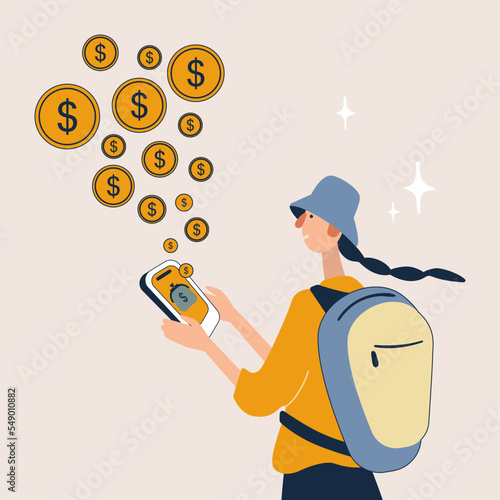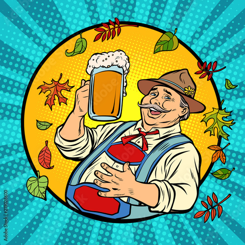 Vektorová ilustrace šťastného podnikatele, který drží tašku s penězi se znaménkem dolaru. Obchodní úspěch, pocity a emoce koncept v retro pop art komiksovém stylu. Bublina.