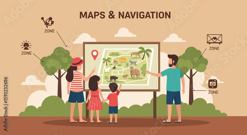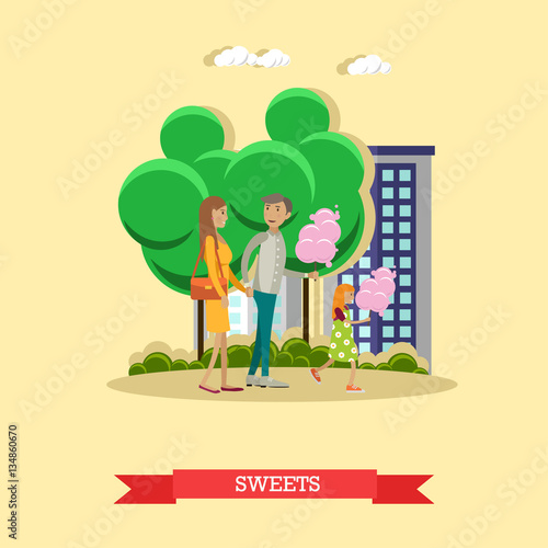 Vektorové ilustrace otce, matka se drží za ruce a jejich dcera s cukrovou vatou. Animace. Zábavní park, rekreační koncept designový prvek v plochém stylu.